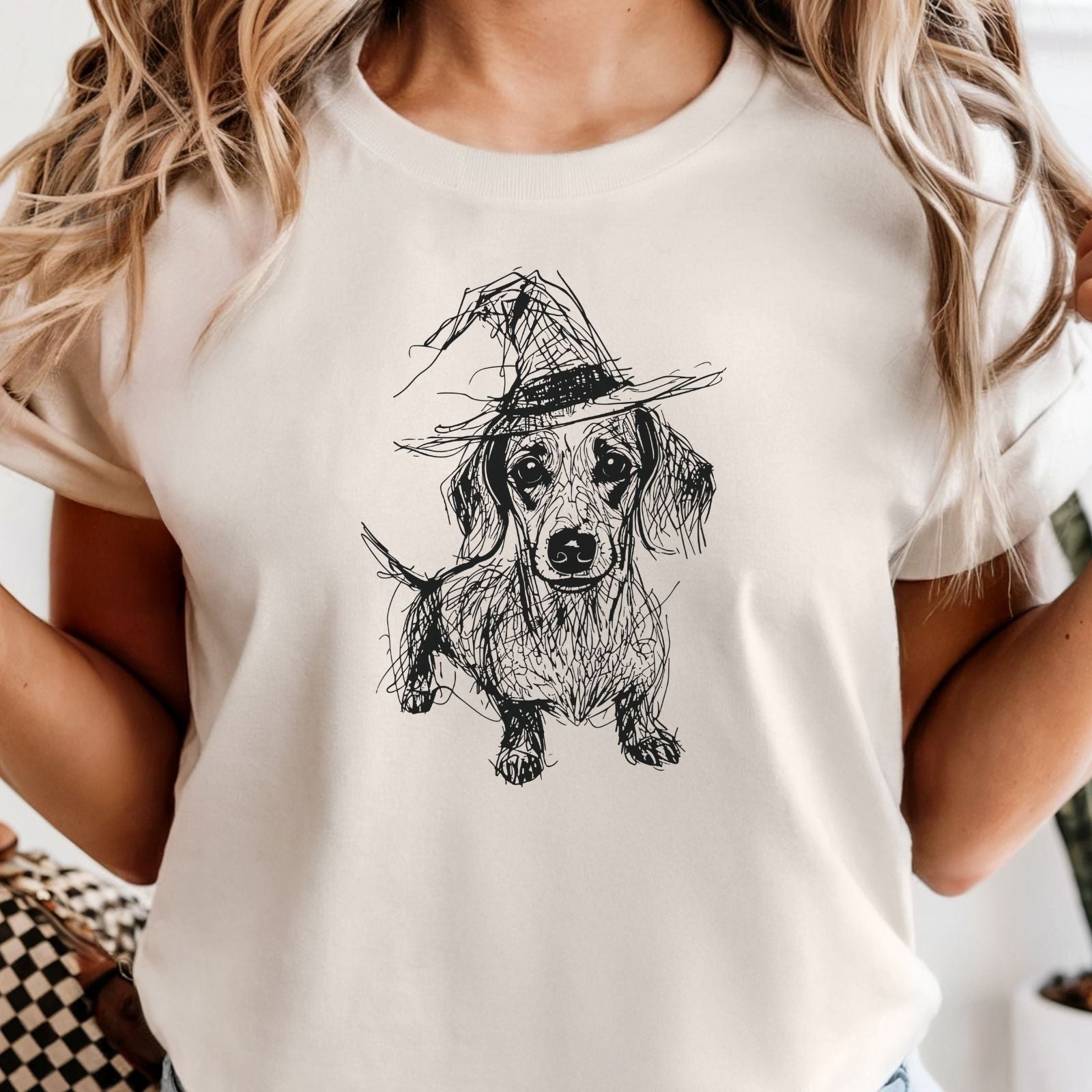 Get spooky in style with this minimalist-meets-magical Halloween dachshund shirt, featuring a hand-drawn line art illustration of a doxie rocking a witch hat. Whether you’re headed to a pumpkin patch, handing out candy, or cozying up with your favorite furry friend, this sweatshirt blends seasonal charm with dog-lover flair. The sketch-style design gives it an artsy, whimsical vibe, perfect for dachshund moms, Halloween lovers, and those who believe a little magic (and a lot of dog hair) makes everything better.